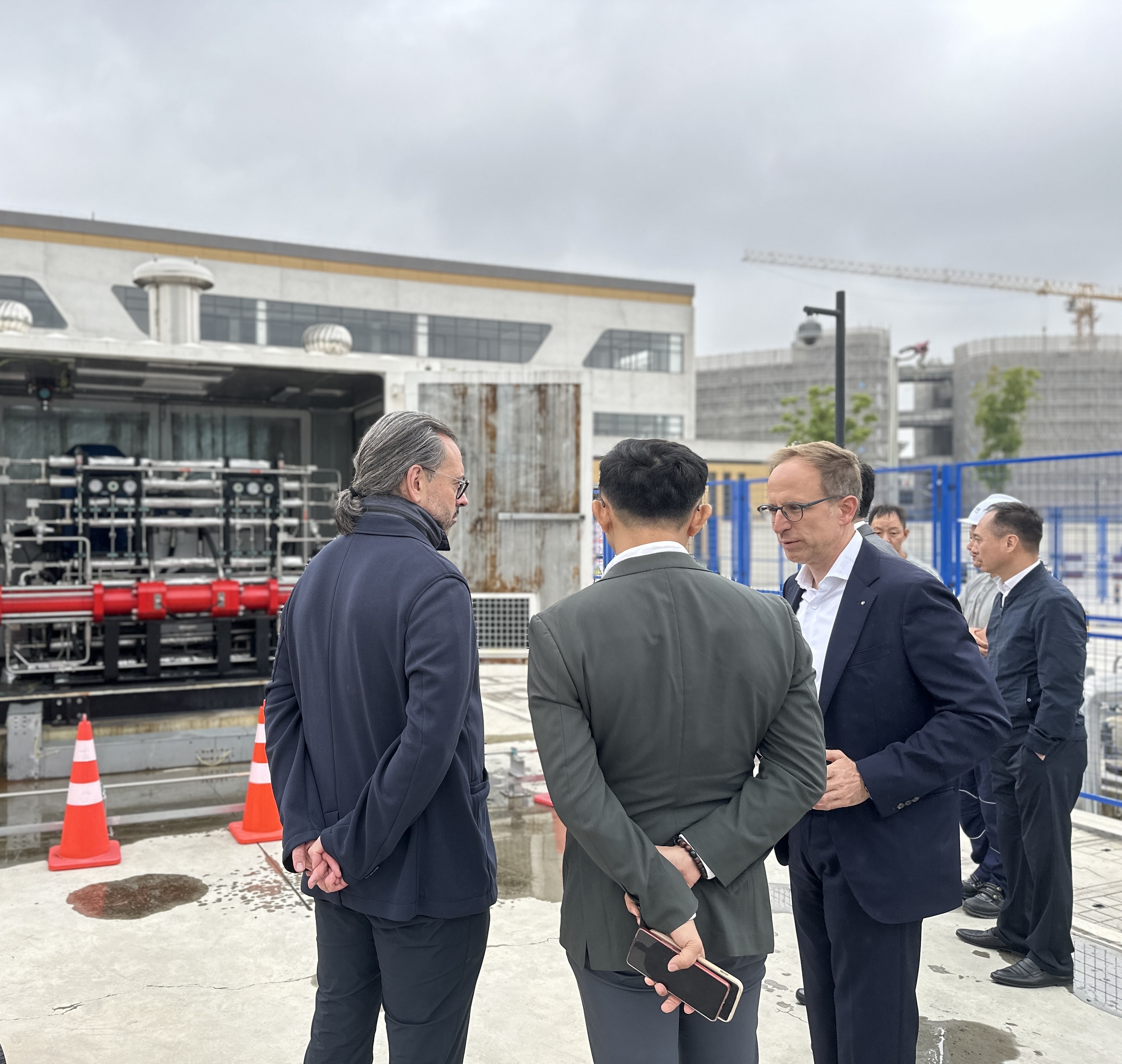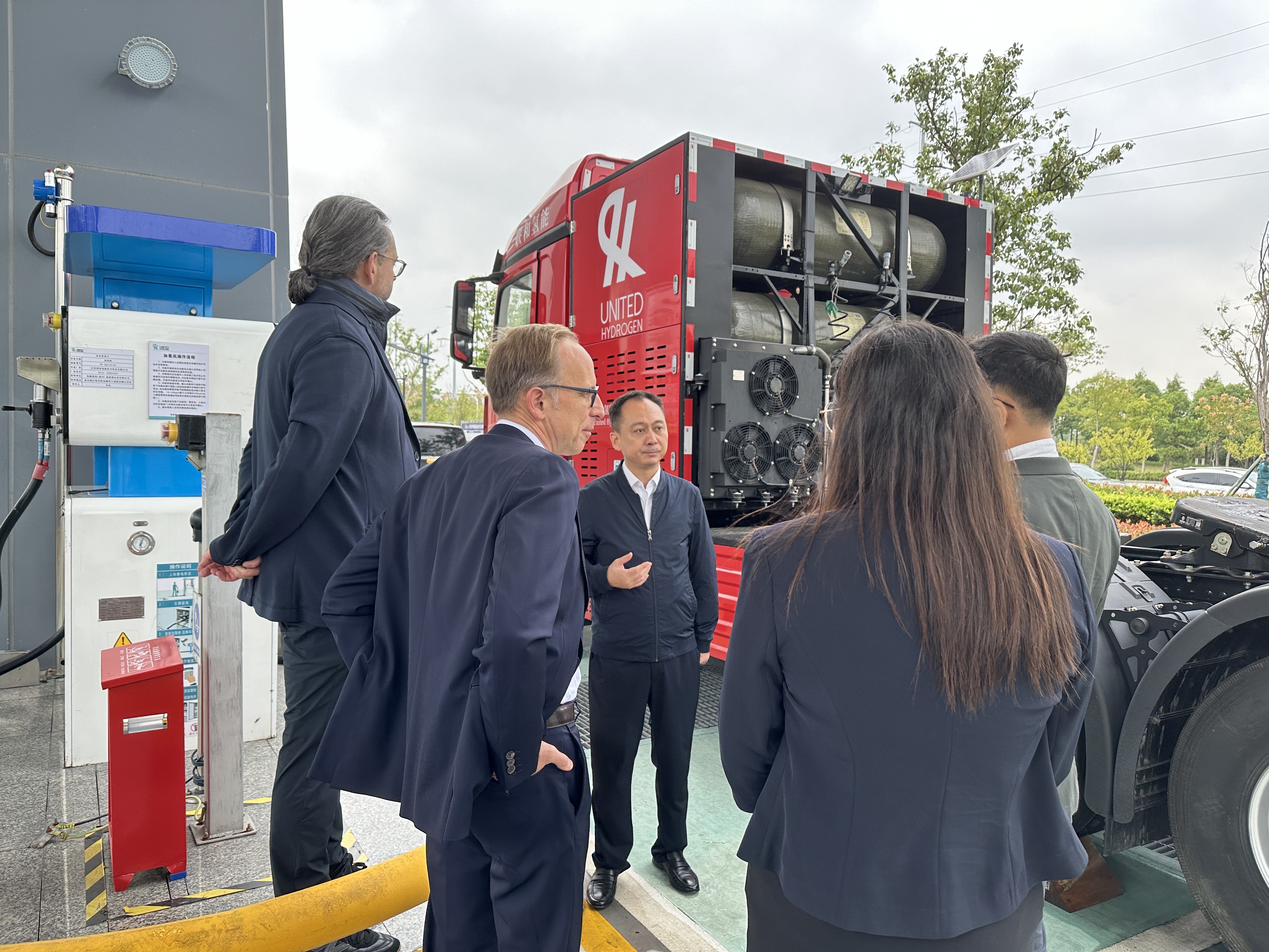 访问的第一站是联和氢能东方氢港加氢站。加氢站作为氢能产业链中的重要一环,是氢能车辆能源补给的关键节点。联和氢能凭借其深厚的行业底蕴、无懈可击的安全记录,确保每一滴氢能源的转化与供给都达到了前所未有的高效与安全标准。联和氢能东方氢港加氢站采用智能化站控管理系统,实现加氢全过程的精准监控,确保运营的安全性。站内不仅设施完备,还充分考虑到未来发展需求,预留的扩容空间可增加管道供氢、70MPa加注等设备设施,旨在升级为二级加氢站,以满足未来市场对氢能日益增长的需求,展现联和氢能对氢能产业发展趋势的深刻洞察与前瞻性布局。Peter先生对加氢站的高效能和高安全标准给予了高度评价,并对联和氢能在氢能基础设施建设方面的专业能力表示赞赏。